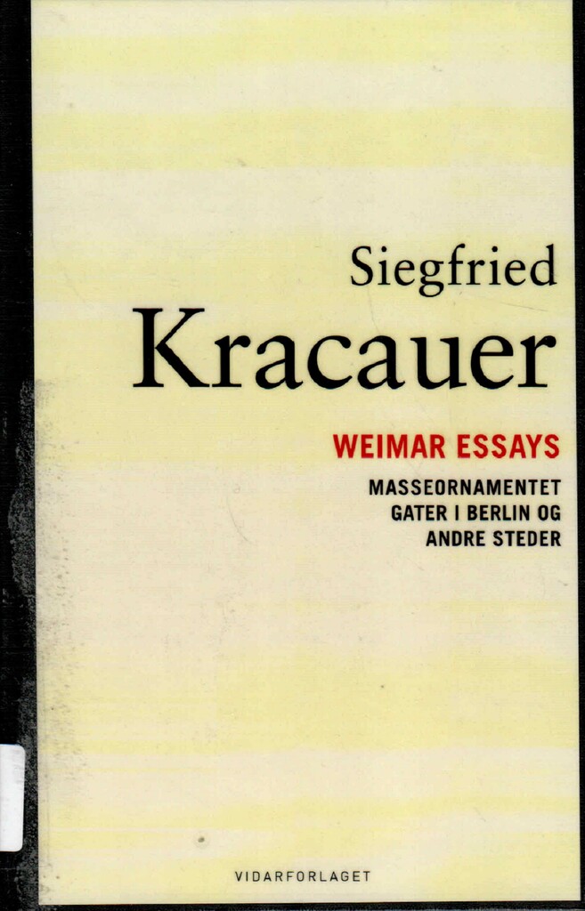 Weimar essays består av to bøker: Masseornamentet og Gater i Berlin og andre steder og er Kracauers eget utvalg av tekster fra 1920-1933. Temaene spenner vidt, fra fotografi og film, arkitektur og byplanlegging, reise og dans, krim, biografier og bestselgere, vitenskap og religion, atspredelse og kjedsomhet- til byer og gater, kafeer og barer, varmehaller og arbeidskontorer, julemarkeder og kinoer, mystiske ting og merkelige mennesker. Kracauer skriver klokt, ironisk, morsomt, krast kritisk og med varm menneskelighet.